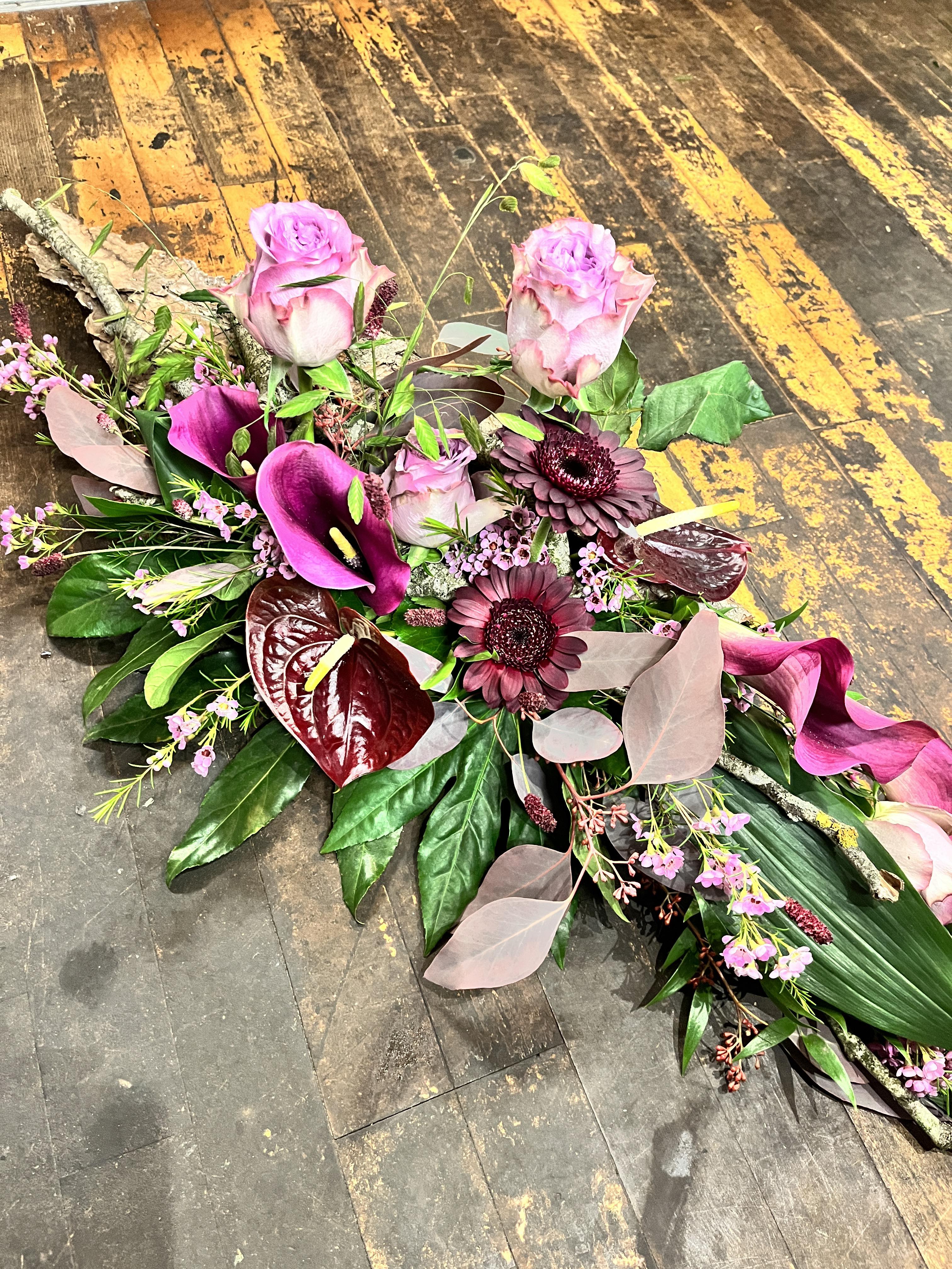 Ønsker du en dekoration til begravelsen, der skiller sig ud, så er denne smukke båredekoration med rustikke detaljer et godt valg. Den flotte aflange og smalle form vil pryde øjet og kan ses fra alle vinkler.