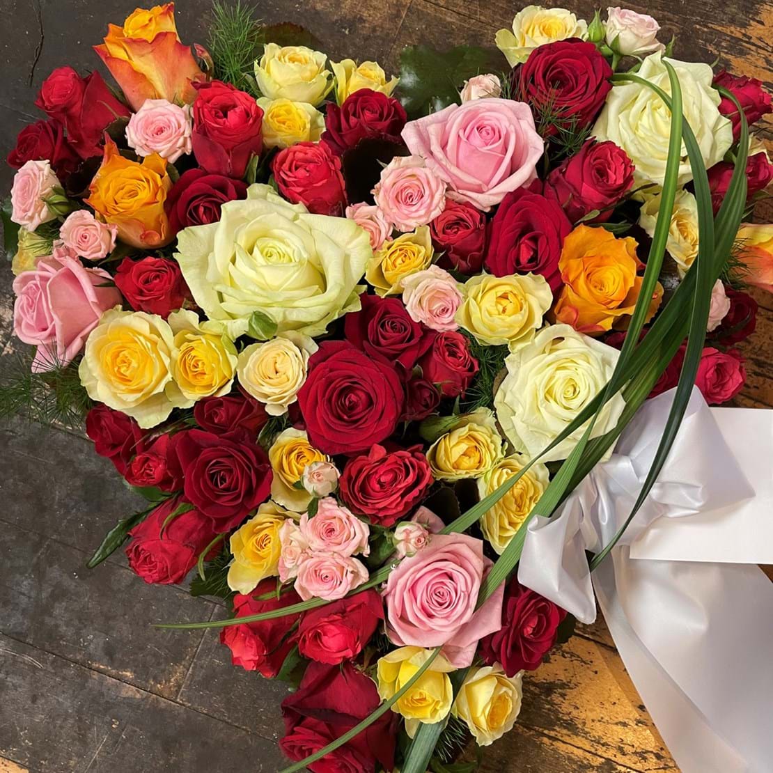 Et hjerte, der kun består af roser, har et stærkt udtryk, og det står meget unikt blandt andre begravelsesbinderier, særligt når du vælger flere farver. Smukt, enkelt og kærligt.