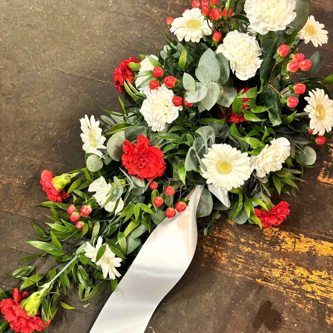 En båredekoration er lidt større end en bårebuket, men må ikke forveksles med en kistepynt.