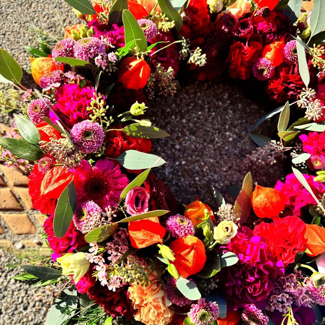 En elegant og lun sidste hilsen fyldt med blomster i varme nuancer. Du får her et klassisk tæt udtryk, fyldt med kærlighed og varme.