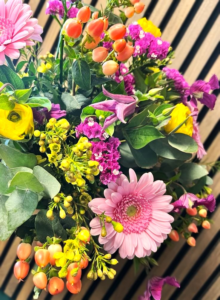 Forår hos Bugge Blomster er lig med gule og lyserøde nuancer i buketten. Derfor er denne smukke og blandede buket blomster et godt valg til foråret, som vil lyse ethvert hjem op.