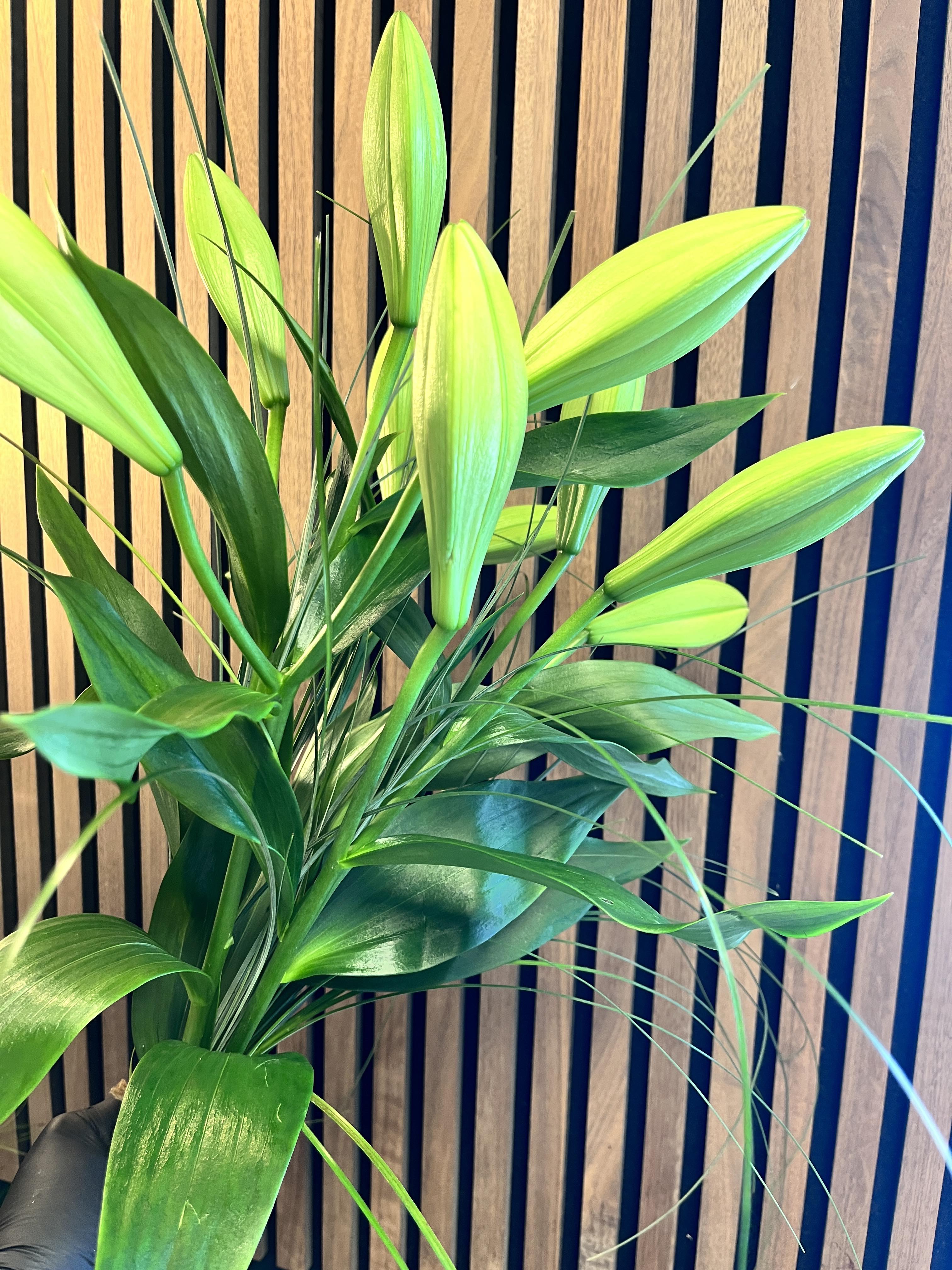 Til personen der elsker liljer! Der findes næsten ikke noget smukkere end når liljer springer ud. Derfor får man med en liljebuket også en lidt længere holdbarhed, da de typisk er "langt" tilbage, som på billedet her. Man får hurtigt øje på den smukke buket, da liljerne bliver bundet i deres fulde flotte længde.